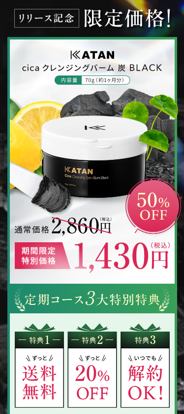 『katan cica クレンジングバーム』の公式サイトでは、現在、初めて購入されるお客様限定で、通常価格から大幅な割引が適用される特別キャンペーンを実施中です。